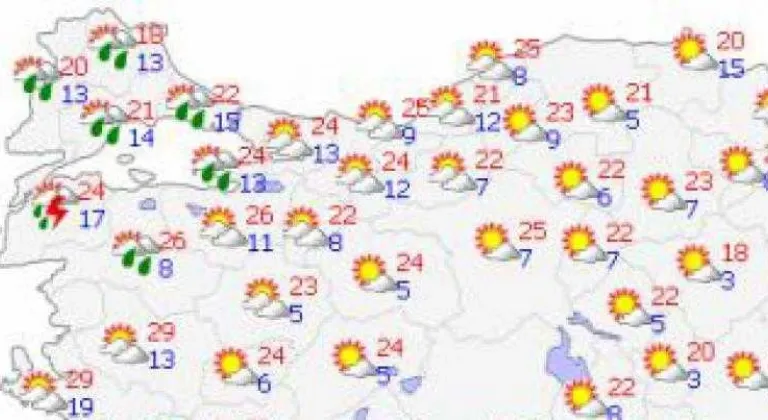 Meteoroloji Genel Müdürlüğü tarafından yapılan son değerlendirmelere göre, ülkemizin kuzey ve batı kesimlerinin parçalı ve yer yer çok bulutlu, Trakya ile İstanbul ve Çanakkale çevrelerinin yerel olmak üzere sağanak ve yer yer gök gürültülü sağanak yağışlı, diğer yerlerin az bulutlu ve açık geçeceği tahmin ediliyor.