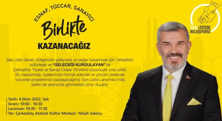 Toplantıda Başkan Adayı Ahmet Çetin, proje ve vaatlerini slayt sunumu eşliğinde açıklayacak. Ahmet Çetin’in projelerinin sunum programı öncesinde, “Sarı liste olarak, bölgemizin gelişmesi ve değer kazanması için; birleştirici, bütünleşik ve ‘Geleceği Kurgulayan’ bir Çerkezköy Sanayi ve Ticaret Odası Yönetimi vizyonuyla yola çıktık. Bu kapsamda, üyelerimize hizmet edecek ve çözüm üretecek vizyoner projelerimizi paylaşacağımız Sarı Liste Lansmanı’nda tüm üyelerimizi aramızda görmekten onur duyarız.” dedi.