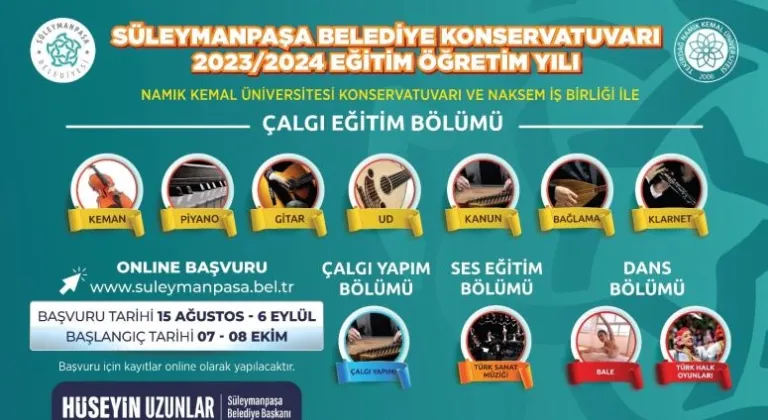 Süleymanpaşa Belediye Konservatuvarı, 2023-2024 Eğitim-Öğretim yılı için kayıt kabul etmeye başladı. 15 Ağustos Salı günü başlayan kayıtlar, 6 Eylül Çarşamba gününe kadar çevrimiçi olarak yapılabilecek. Konservatuvar, iki aşamalı sınavla öğrenci kabul edecek.