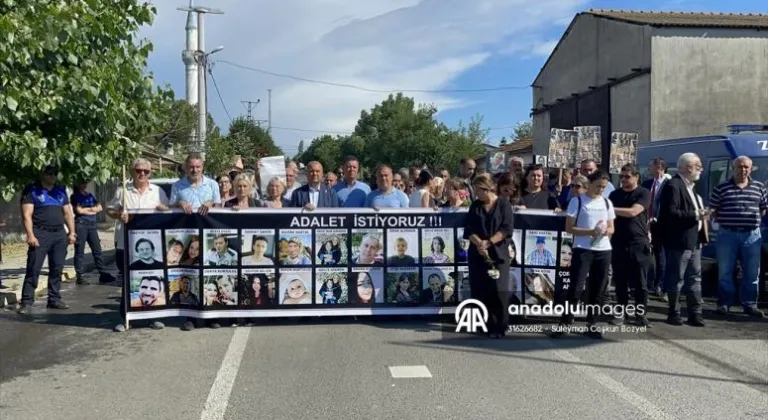 Sarılar Mahallesi'ndeki tren yolu yakınlarında bulunan 8 Temmuz Anıtı önünde toplanan bir grup, kazada hayatını kaybedenlerin fotoğraflarının bulunduğu brandayı açtı.
