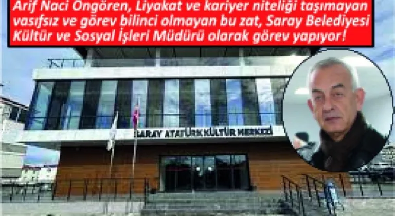 Kültür ve Sosyal yönetmeliğin amacı, Belediyelerin Kültür ve Sosyal İşleri ve bu İşlerin Müdürü olanlar kişiler görev, yetki ve sorumlulukları ile çalışma usul ve esaslarını iyi bilmeli. Peki, Saray Belediyesi Kültür ve Sosyal İşler Müdürü Arif Naci Öngören, görevinin sorumluluğunu ne kadar biliyor? Hiçbir şey bildiği yok! Sadece kurumda günü kurtarmaya çalışıyor. Yani salla başını al maaşını, mantığıyla zaman dolduruyor. Hatta zaman da dolmuş ve buna da göz yumanlar var.