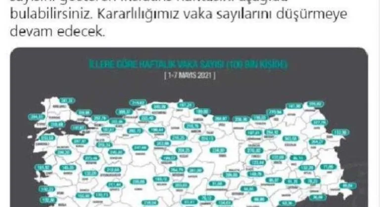 Bakan Koca, Twitter 'daki hesabından yaptığı açıklamada, 1-7 Mayıs'ta il bazında 100 bin nüfusa karşılık gelen haftalık Covid-19 vaka sayılarına yer vererek, "Kararlılığımız vaka sayılarını düşürmeye devam edecek" dedi.