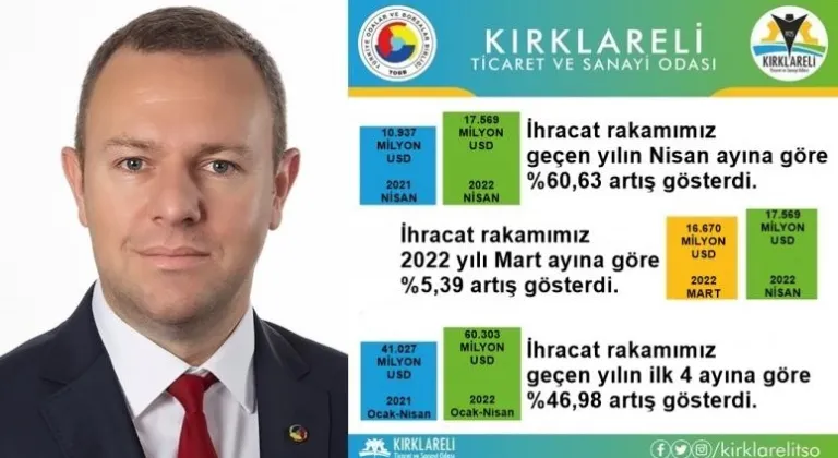 “Kırklareli merkezli firmalar 2022 Mart ayında 60.303 milyon dolar ihracat rakamına ulaştı. 2022 yılı Nisan ayında ilimizden yapılan İhracat 2022 yılı Mart ayına göre %5,39 artış, 2021 yılının Nisan ayına göre ise de %60,63 artış gösterdi. 2022 yılının ilk 4 ayında Kırklareli’nden yapılan ihracat rakamı toplamı 60.303 milyon dolara yükselerek, 2021 yılının ilk 4 ayına kıyasla %46,98’lik bir artış gösterdi.