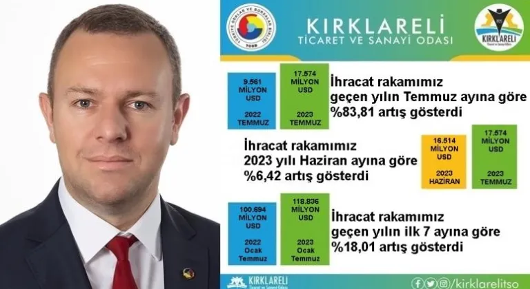 “Kırklareli merkezli firmalar 2023 Temmuz ayında 17.574 milyon dolar ihracat rakamına ulaştı. 2023 yılı Temmuz ayında ilimizden yapılan İhracat 2023 yılı Haziran ayına göre %6,42 artış, 2022 yılının Temmuz ayına göre ise de %83,81 artış gösterdi. 2023 yılının ilk 7 ayında Kırklareli’nden yapılan ihracat rakamı toplamı 118.836 milyon dolara yükselerek, 2022 yılının ilk 7 ayına kıyasla %18,01’lik bir artış gösterdi.