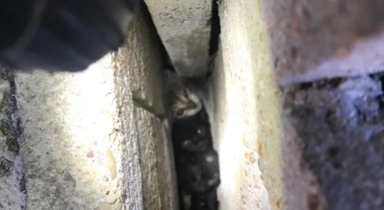 İhbar üzerine olay yerine giden itfaiye ekipleri apartman ile bahçe duvarı arasına sıkışan beş yavru kediyi bulundukları yerden çıkarttı.