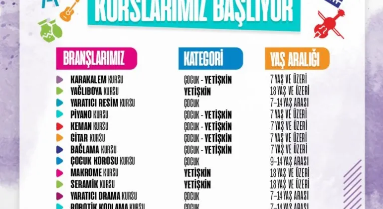 Geleneksel el sanatları, sahne sanatları, teknoloji tasarım, görsel ve işitsel sanat dallarından oluşan ve 13 farklı branşta gerçekleştirilecek olan Kültür ve Sanat Akademisi Güz Dönemi Sanat Kursları kapsamında Karakalem, Yağlı Boya, Yaratıcı Resim, Piyano, Gitar, Keman, Bağlama, Çocuk Korosu, Dekoratif Ahşap Süsleme, Makrome, Seramik, Yaratıcı Drama ve Robotik Kodlama kursları verilecek.