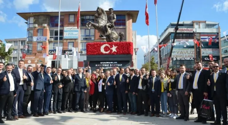 Sarı Liste ekibi, Çerkezköy’deki bayrak dağıtımı programının arasında öğlen saatlerinde düzenlenen 29 Ekim Cumhuriyet Bayramı çelenk sunum törenine de katıldı. Çerkezköy Kaymakamlığı’nca organize edilen çelenk sunum törenine katılan Sarı Liste ekibi ve Başkan Adayı Ahmet Çetin, Atatürk Anıtı’ndaki törenin ardından günün anısına fotoğraf çekilmeyi de ihmal etmedi. Burada Sarı Liste Başkan Adayı Ahmet Çetin, protokol üyelerin ede Türk Bayrağı hediye etti. Çerkezköy Belediye Başkanı Vahap Akay ve Başkan Yardımcısı Nedim Yılancı’ya Türk Bayrağı’nı veren Başkan Adayı Ahmet Çetin, Cumhuriyet Bayramları’nı kutladı. Çerkezköy’de Türk Bayrağı açan Sarı Liste ekibi, Cumhuriyet Bayramı Coşkusu’nu bir gün öncesinden başlattı.