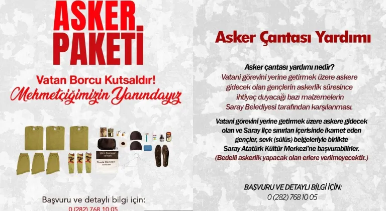 Sosyal ve Kültür İşler Müdürlüğümüz tarafından hazırlanan asker çantası yardımı için, uzun dönem askerliğe gidecek olan evlatlarımızın ikametgah belgesi, kimlik fotokopileri ve sülüs belgeleri ile Atatürk Kültür Merkezi’ne başvurmaları gerekmektedir. Tüm askerlerimize şimdiden hayırlı teskereler diliyorum. Ayağınıza taş değmesin” diye konuştu.