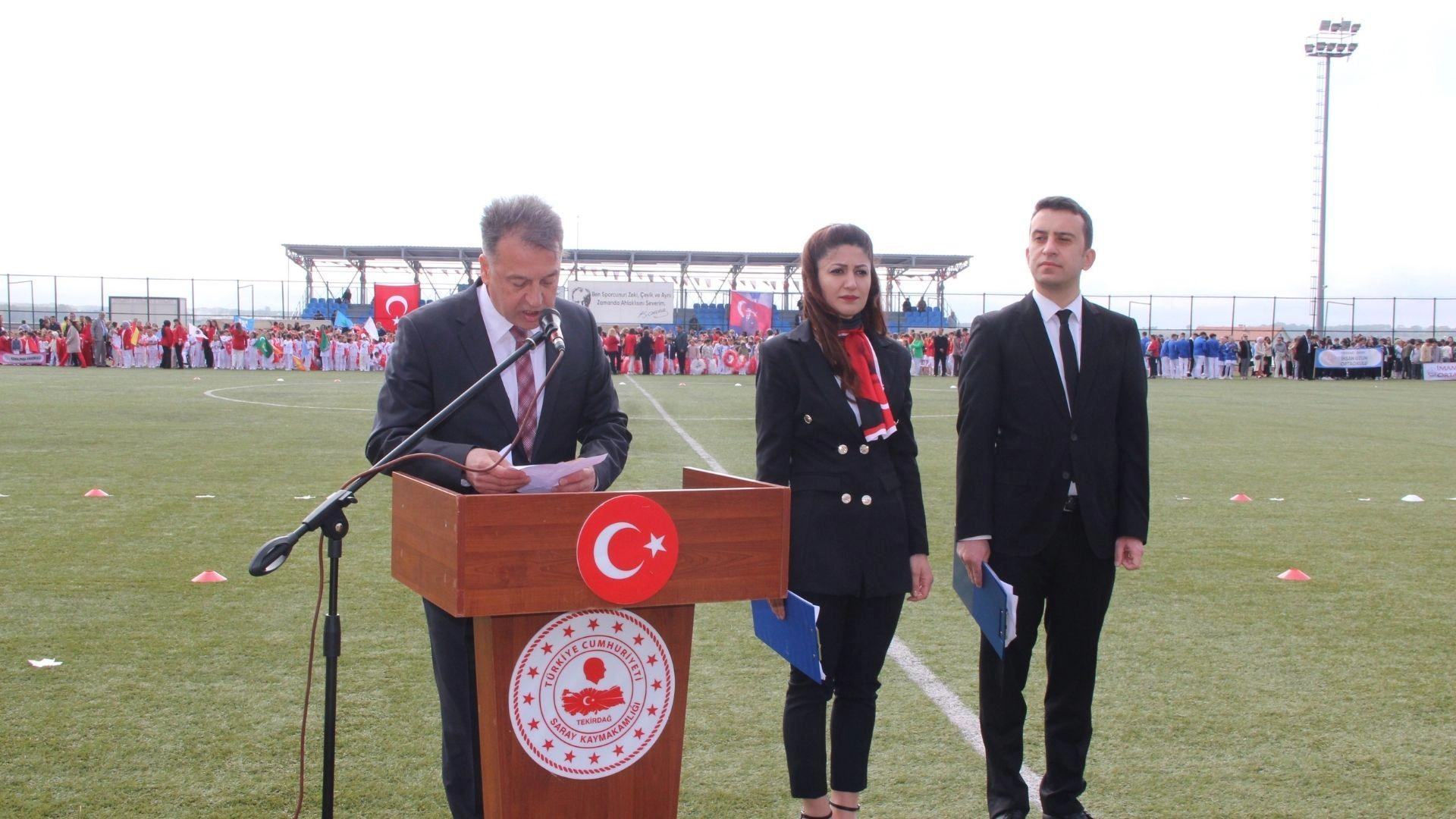 Çelenk sunma töreninin ardından kutlamalar saat 10.00’da Saray Stadyumu’nda devam etti. Günün anlam ve önemini belirten konuşmayı Saray İlçe Milli Eğitim Müdürü Yusuf Hayri yaptı.