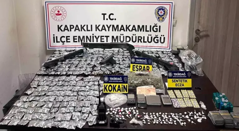 Tekirdağ İl Emniyet Müdürlüğü Narkotik Suçlarla Mücadele ekipleri, ilçede yürütülen çalışmalar kapsamında Y.A., S.Ç., A.E. ve A.B.B. isimli şahısları takibe aldı. Şüphelilerin ikamet ve araçlarında yapılan aramada 1 kilogram 363 gram skunk, 153 gram kokain, 81 adet sentetik ecza, 1 ruhsatsız tabanca, 34 tabanca fişeği, 3 av tüfeği, 5 hassas terazi ve 1 el telsizi ele geçirildi.