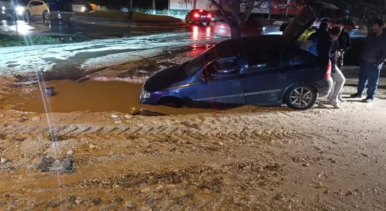 Akşam saatlerinde yoldan geçen bir otomobil, aniden çöken zemine saplandı. Yolun çökmesiyle birlikte su borusu da patlayınca, aracın ön kısmı birkaç dakika içinde suyun altında kaldı. Araç sürücüsü hızla araçtan çıkarken, otomobilin daha fazla gömülmesini engellemek için bagaj kısmına oturdu.