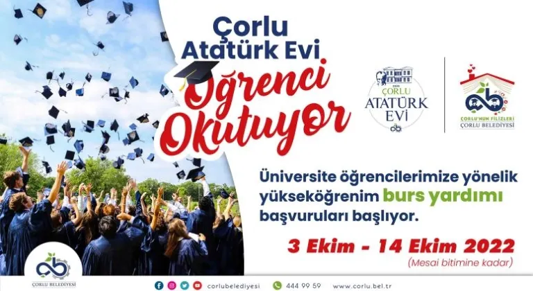 Atatürk Evi'nden elde edilen gelirin yanı sıra Çorlu Belediyesi tarafından sağlanan katkıyla, aileleri Çorlu'da ikamet eden ihtiyaç sahibi üniversite öğrencilerine verilecek olan "Yükseköğrenim Burs Yardımı" için başvurular 3 Ekim 2022 Pazartesi günü başlıyor.